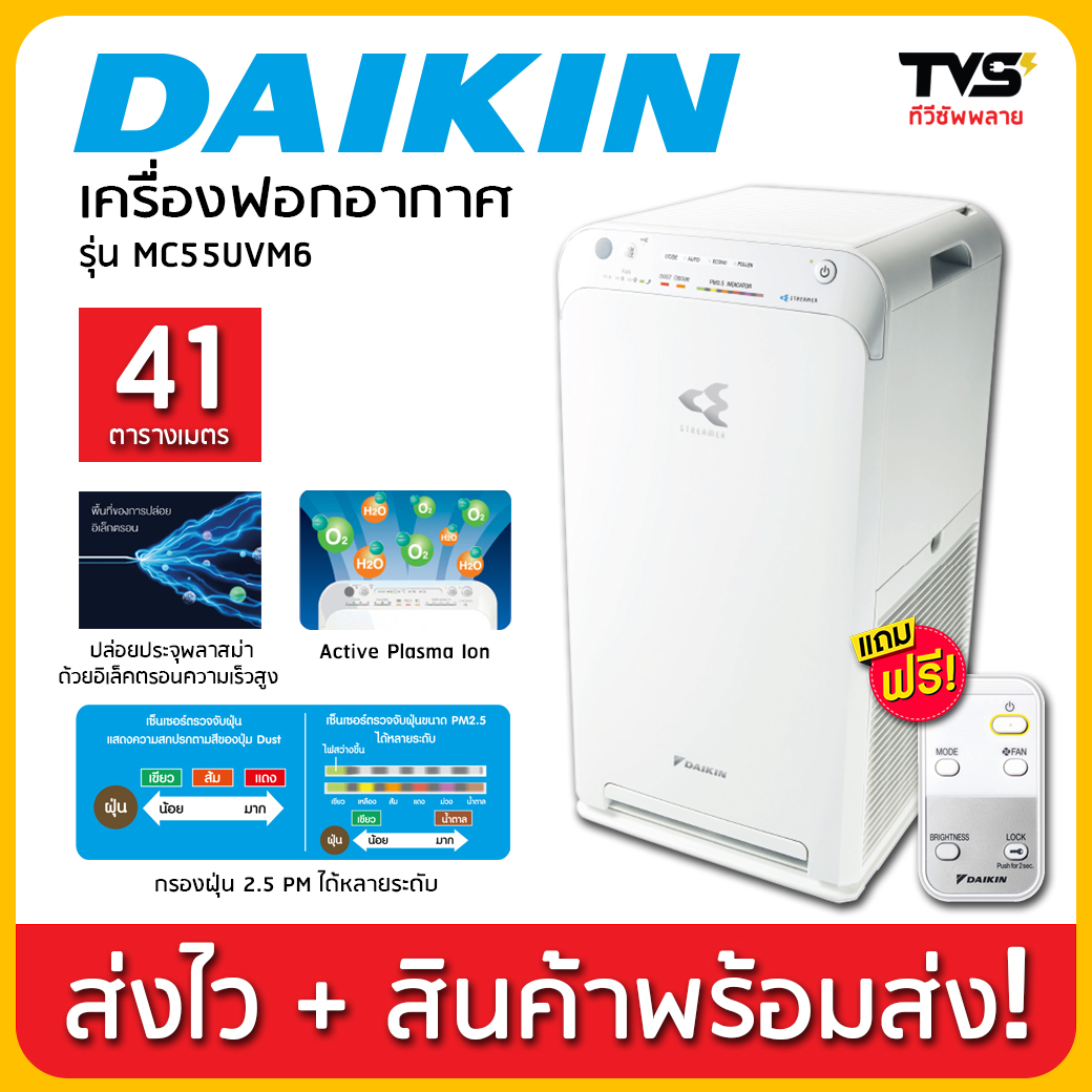 เครื่องฟอกอากาศ daikin ไดกิ้น ระบบแอคทีฟพลาสม่าและสตรีมเมอร์ รุ่น MC55UVM6 ขนาด 41 ตรม. ช้อปปิ้งออนไลน์ทางแอพและเว็บไซด์ราคาถูกที่สุด จัดส่งทั่วประเทศ มีสต๊อกพร้อมในไทย