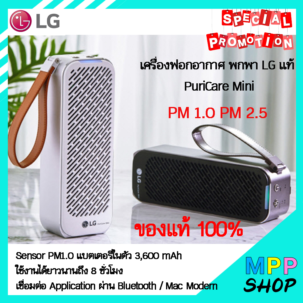 - เครื่องฟอกอากาศขนาดพกพา LG PuriCare Mini+++ LG PuriCare Mini มีคุณสมบัติพิเศษอะไรบ้าง ? เป็นเครื่องฟอกอากาศขนาดเล็กที่สุดในโลก พกพาสะดวก เปรียบเหมือนคุณเอาอากาศบริสุทธิ์ติดตัวไปด้วยทุกที่ สามารถกำจัดฝุ่นละอองที่มีอนุภาคเล็กถึง 0.3 ไมครอน รวมถึงขจัดแบคทีเรียได้ถึง 99% มีระบบไฟ LED แจ้งเตือนสภาพอากาศว่าเลวร้ายแค่ไหน เครื่องทำงานให้เสียงรบกวนเพียง 30 เดซิเบล ถือว่าค่อนข้างเงียบ ที่สำคัญใช้ได้นาน 8 ชั่วโมงต่อการชาร์จเต็ม 1 ครั้งด้วยสาย USB Type-C